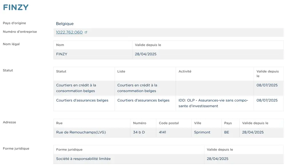 Voici la fiche de Finzy. Si vous ne trouvez pas le prêteur ou l’intermédiaire sur le site de la FSMA, vous êtes très probablement confronté à des arnaqueurs.